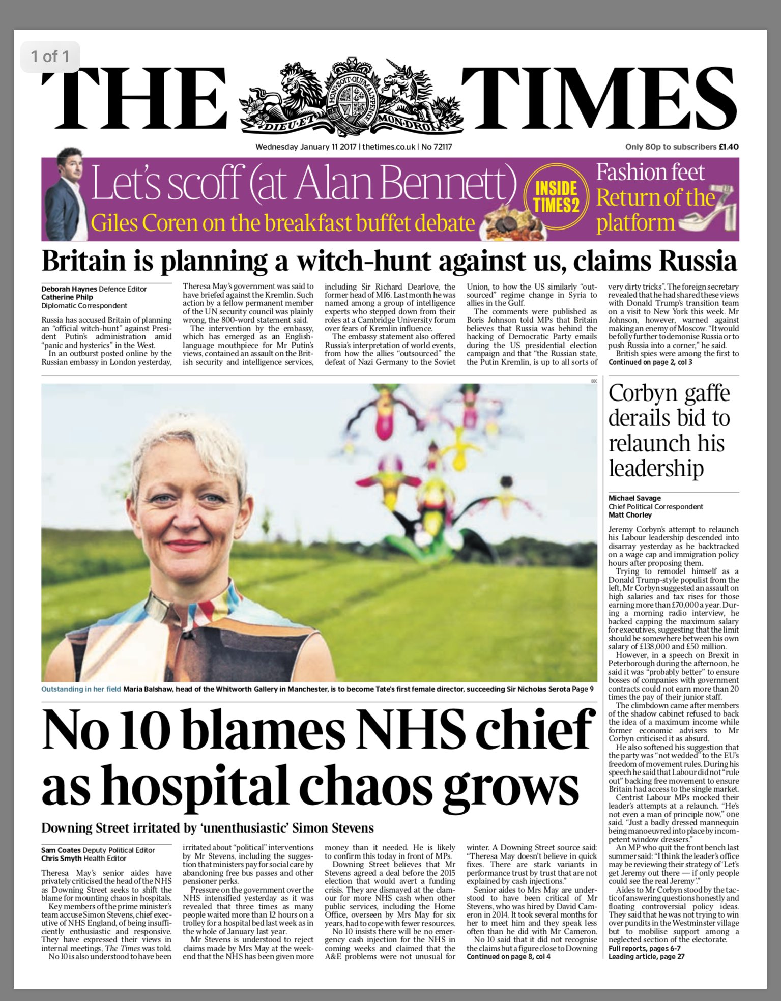 The Times carries a front-page story reporting a rift between Number 10 Downing Street and Sir Simon Stevens, the Chief Executive of NHS England, citing sources who say Stevens “lacks enthusiasm”.